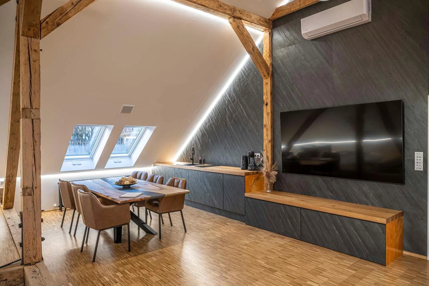 Apartmán Loft je stylový dvoupodlažní podkrovní prostor, který nabízí ubytování až pro sedm hostů se čtyřmi lůžky. Ve spodním patře se nachází koupelna ve stylu black and white se sprchovým koutem. V členitém obývacím prostoru je umístěna vybavená kuchyňka, jídelní a posezení, LED televize s internetovou televizí Lepší.TV a komfortní velká manželská postel. Horní patro apartmánu zahrnuje otevřený mezonet s manželskou postelí a oddělenou ložnici s jednou manželskou postelí a jednolůžkem.Apartmán je vybaven Wi-Fi, klimatizací, sprchou, WC, kosmetickými a toaletními potřebami, osuškami a ručníky. K dispozici je internetová televize, Bluetooth rádio, fén a kuchyňka s ledničkou. Hosté mohou využít kávovar Dolce Gusto, čajový servis a rychlovarnou konvici. Na vyžádání je možné zajistit dětské vybavení, jako jsou postýlka, vanička, nočník, židlička a hračky. Další vybavení zahrnuje elektro nabíječku na auto a hlídané parkování. Hosté mají možnost zajištění snídaně. Celková plocha apartmánu činí 80 m².