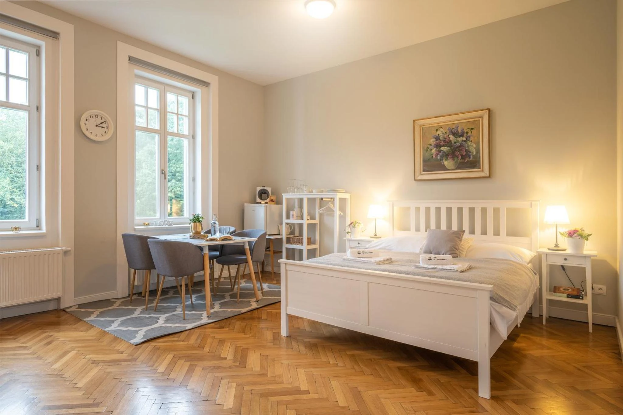 Apartmán je vybaven Wi-Fi, sprchou, WC, kosmetickými a toaletními potřebami, osuškami a ručníky, internetovou televizí Lepší.TV, Bluetooth rádiem, fénem, ledničkou, kávovarem Dolce Gusto a čajovým servisem. K dispozici je rychlovarná konvice a na vyžádání lze zajistit dětské vybavení, jako jsou postýlka, vanička, nočník, židlička a hračky. Další vybavení zahrnuje elektro nabíječku na auto a hlídané parkování. Hosté mohou využít možnost zajištění snídaně. Celková plocha apartmánu činí 55 m².