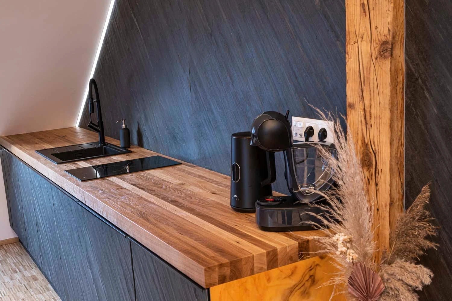 Pro pohodlí hostů je apartmá vybaveno systémem chytré domácnosti LOXONE, vlastní účet na Spotify umožňuje přehrávání hudby přes zabudovaný reprosystém DEXONE. Plně vybavená kuchyň nabízí kávovar Dolce Gusto, čajový servis a minibar. Součástí pokoje je i elektročajový koutek a rychlovarná konvice s bio domácími čaji.