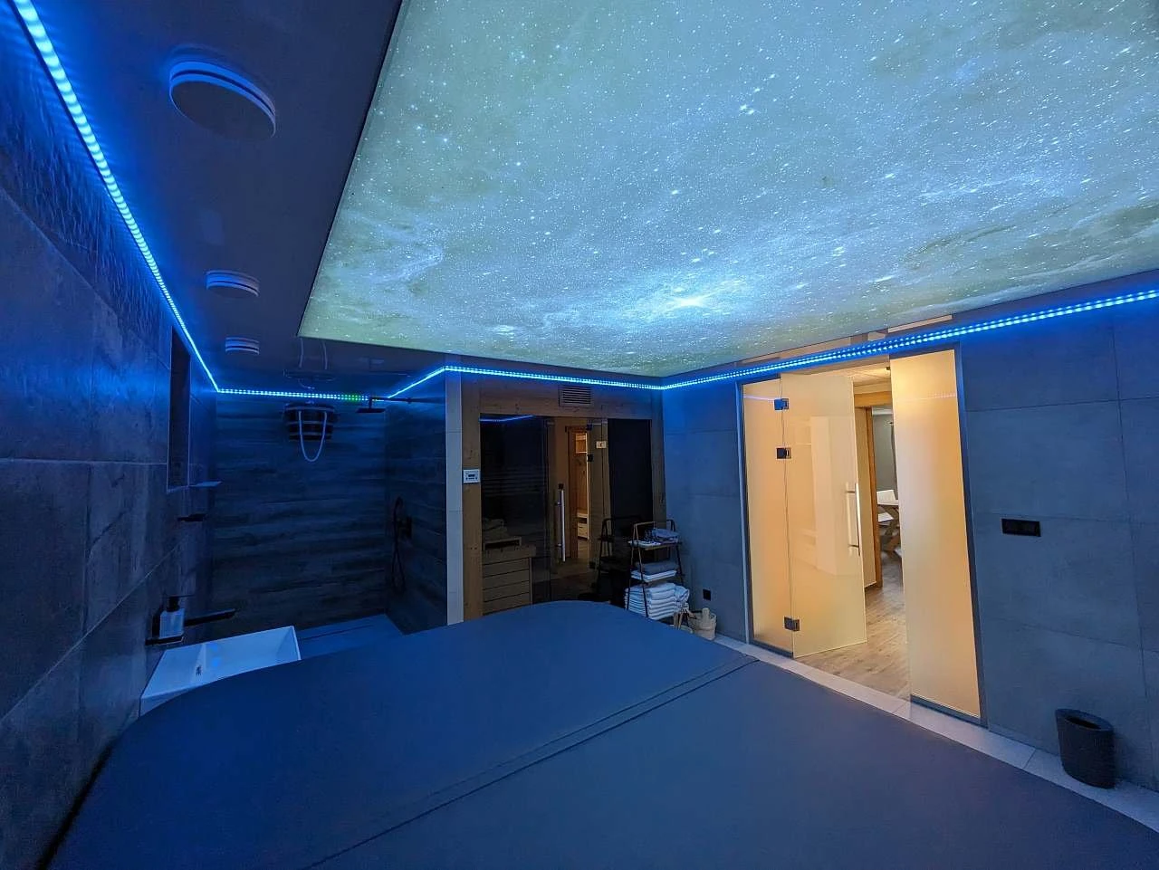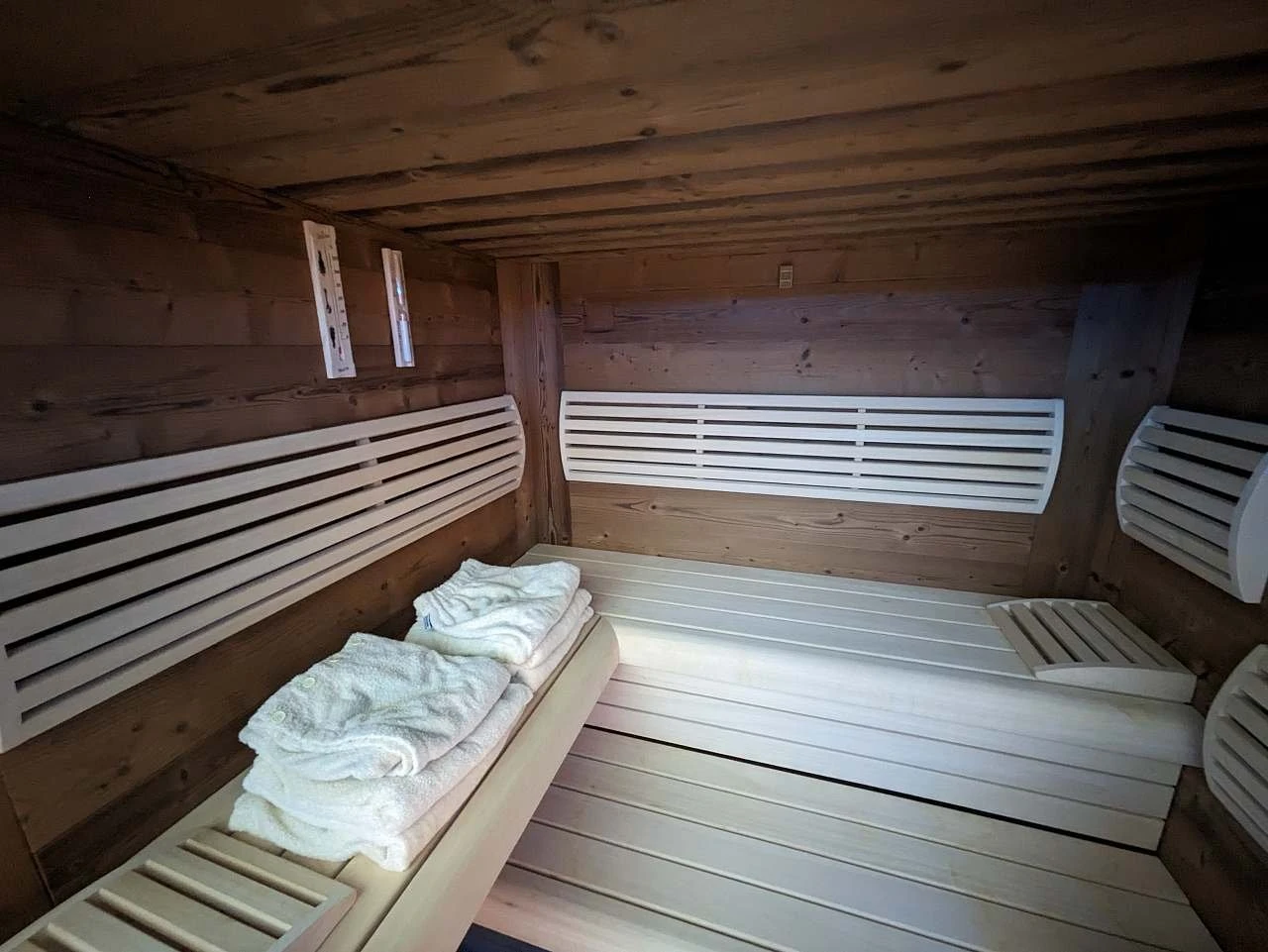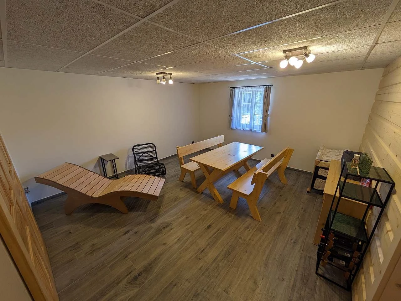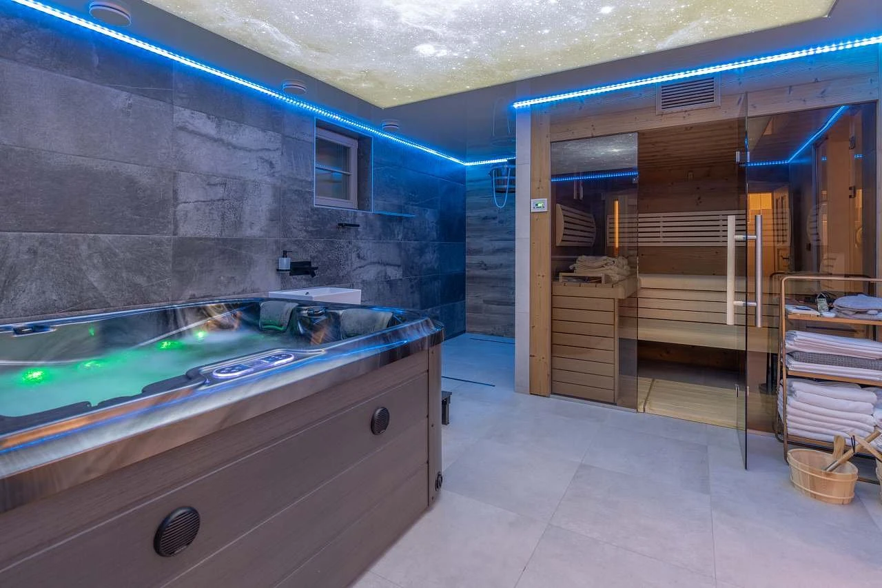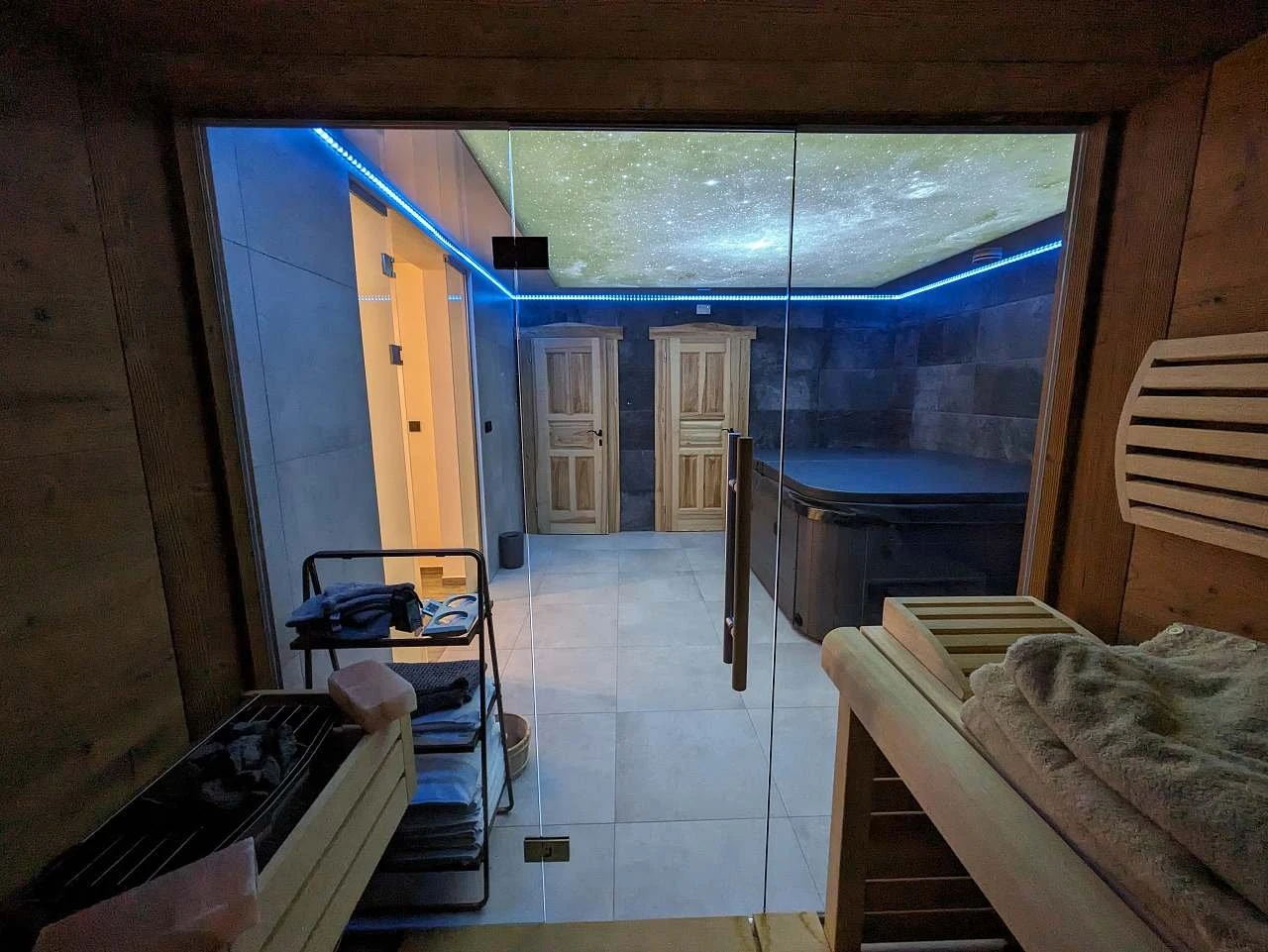 Součástí objektu je soukromé wellness zázemí, které zahrnuje vířivku, finskou saunu a odpočinkovou zónu. V obývací části se nachází krb, který slouží jako hlavní prvek vytápění a zároveň společenský prostor.
