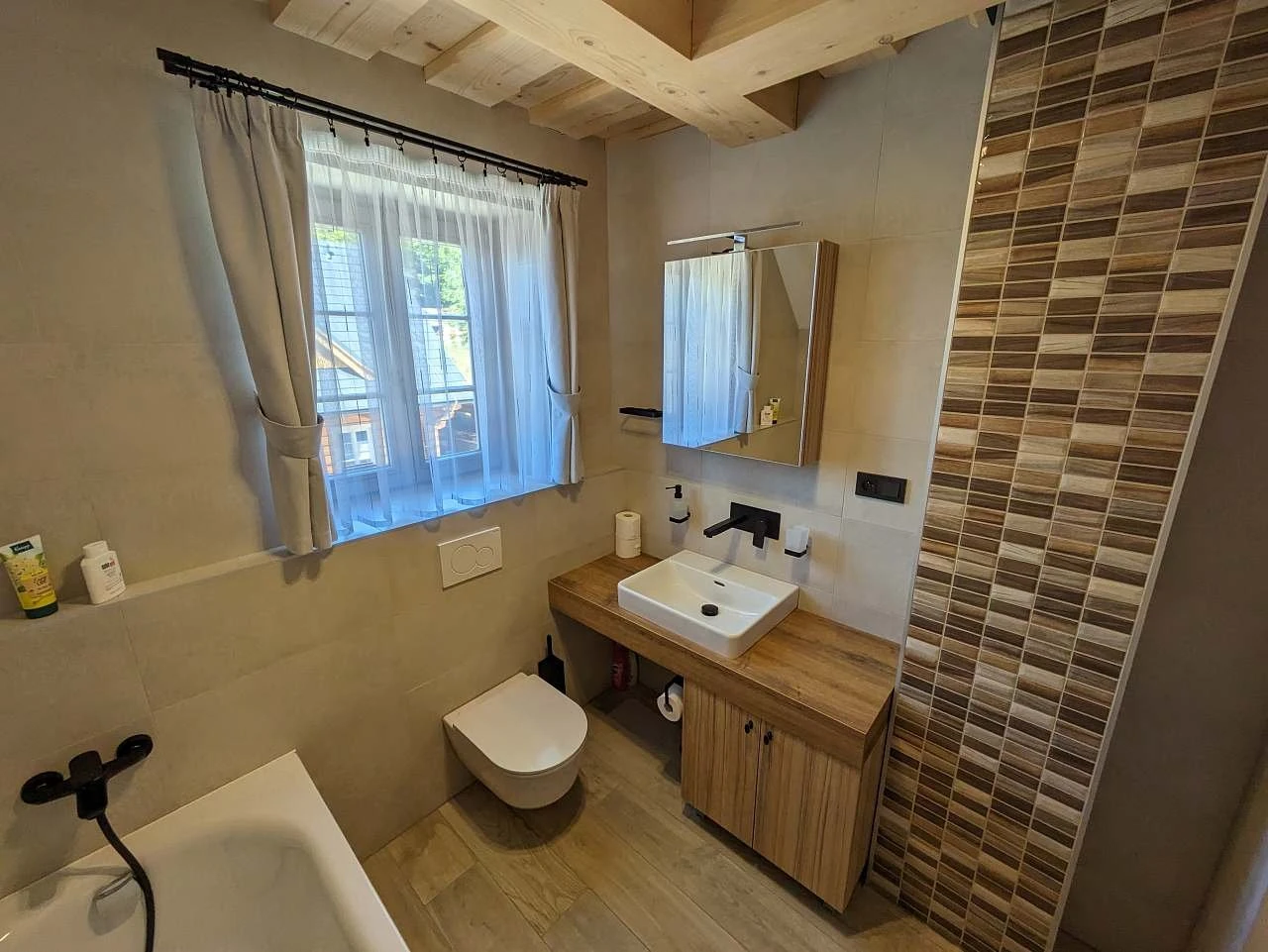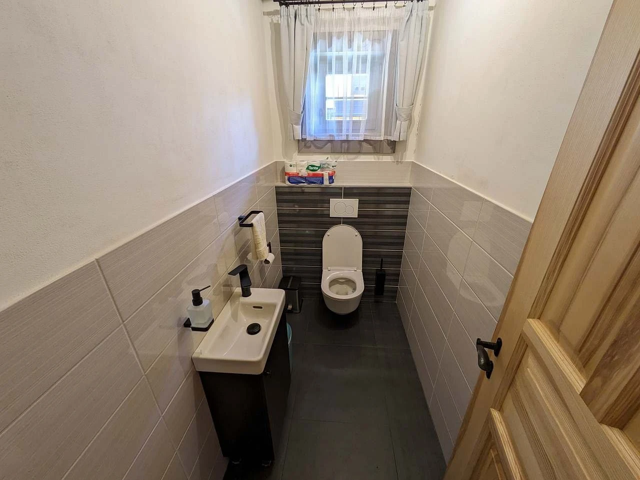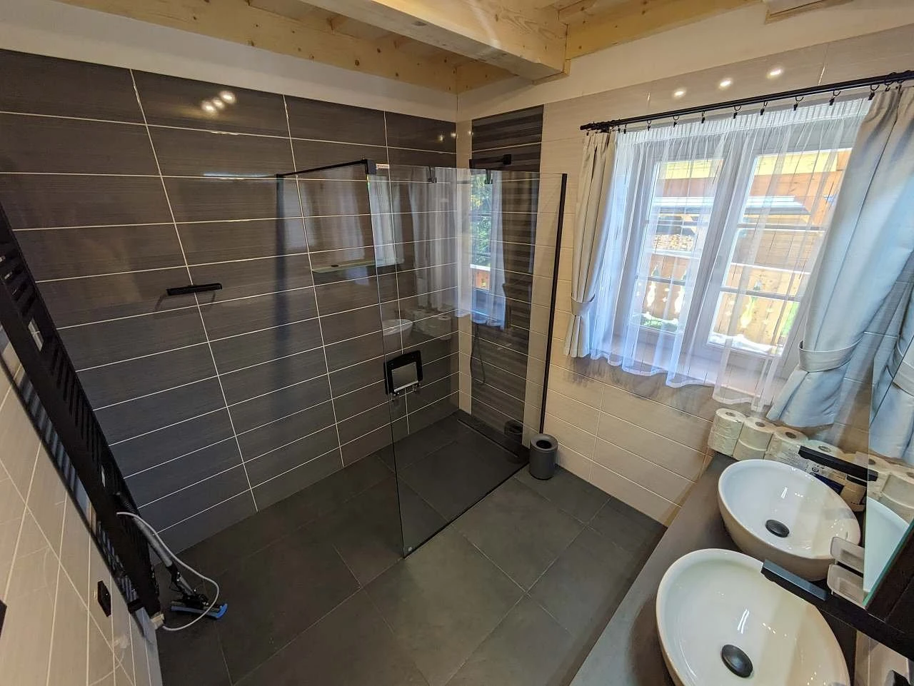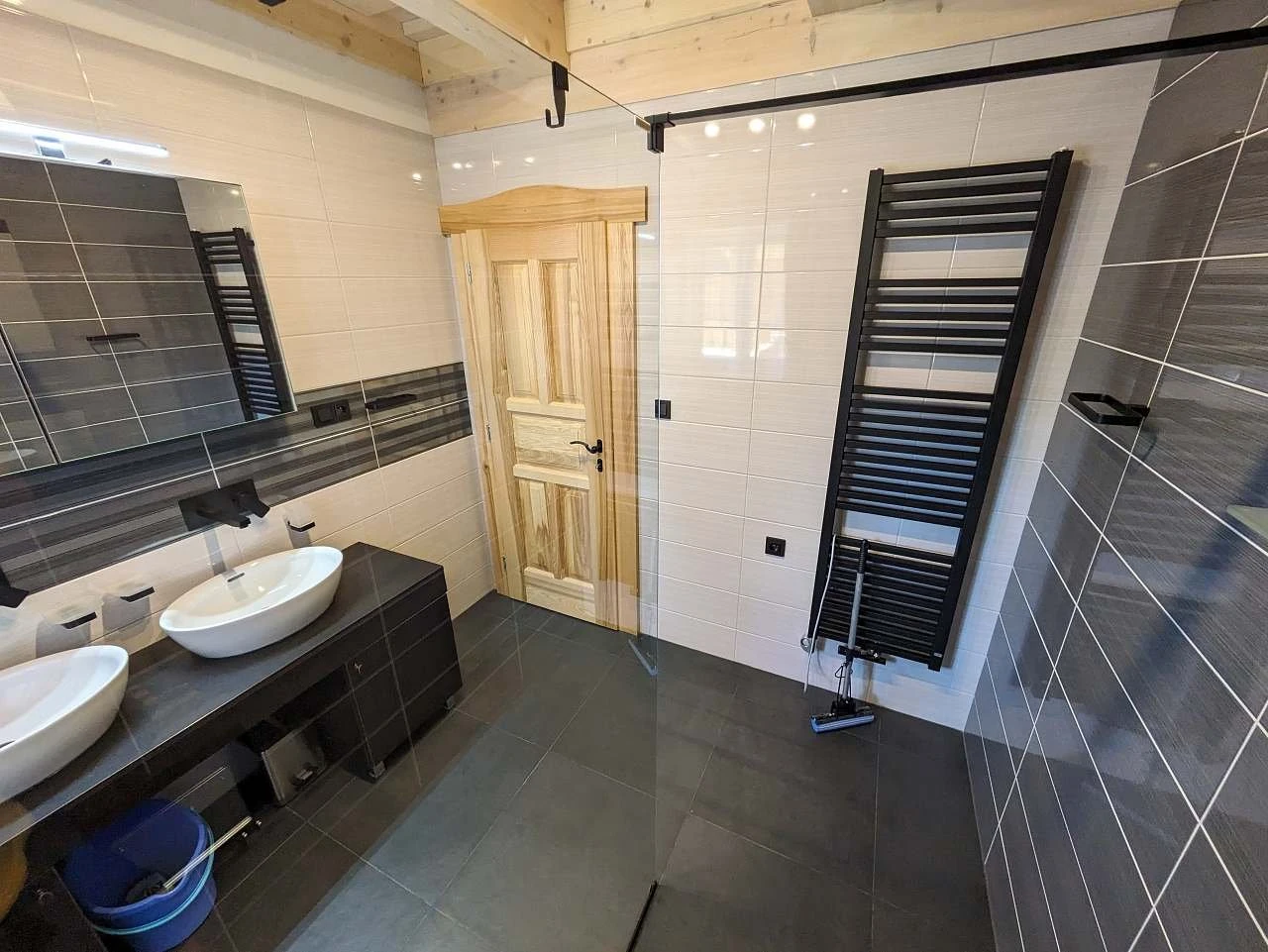 V objektu se nacházejí tři koupelny. Dvě jsou umístěny v patře u ložnic – jedna s vanou, druhá se sprchovým koutem. Třetí koupelna je v přízemí a je součástí wellness zóny, kde navazuje na saunu a vířivku. Všechny koupelny jsou vybaveny toaletou a základním hygienickým zázemím.