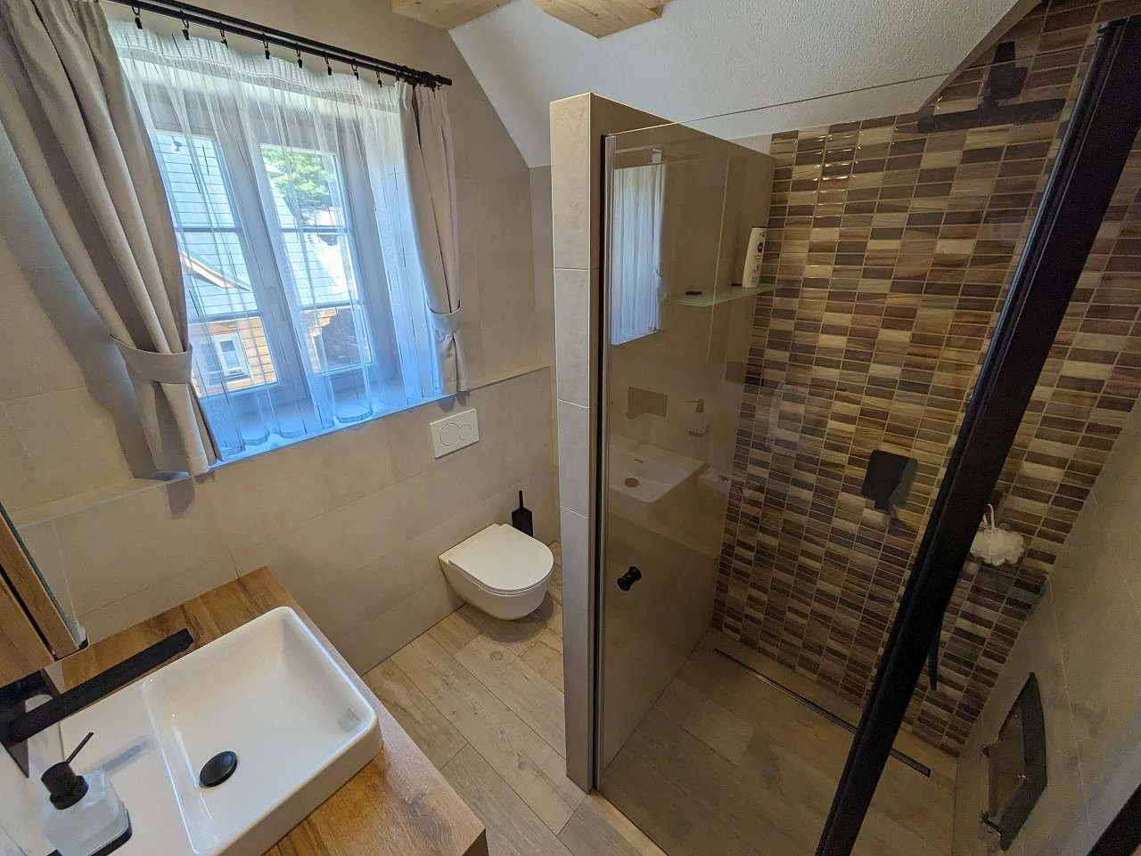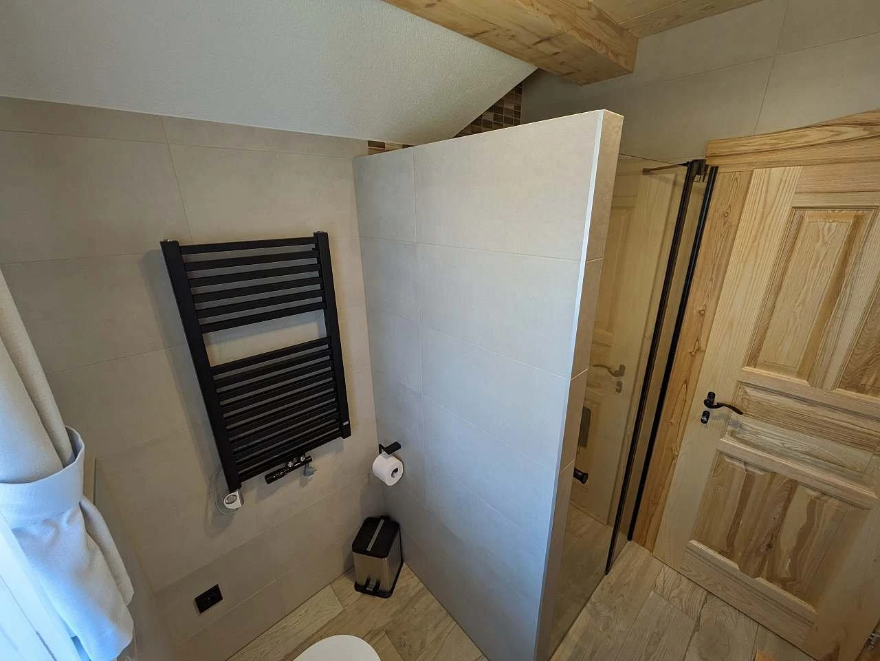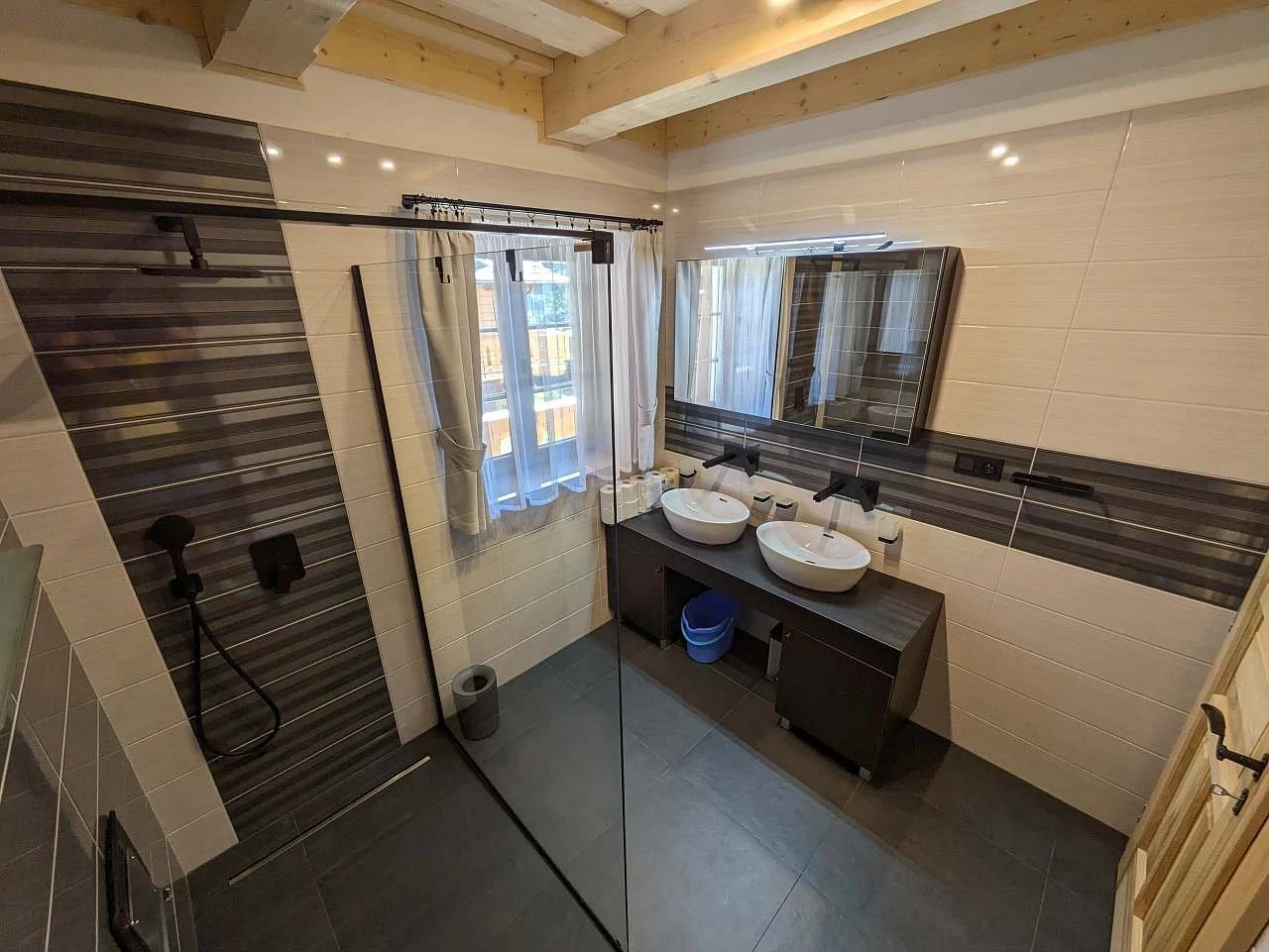 V objektu se nacházejí tři koupelny. Dvě jsou umístěny v patře u ložnic – jedna s vanou, druhá se sprchovým koutem. Třetí koupelna je v přízemí a je součástí wellness zóny, kde navazuje na saunu a vířivku. Všechny koupelny jsou vybaveny toaletou a základním hygienickým zázemím.