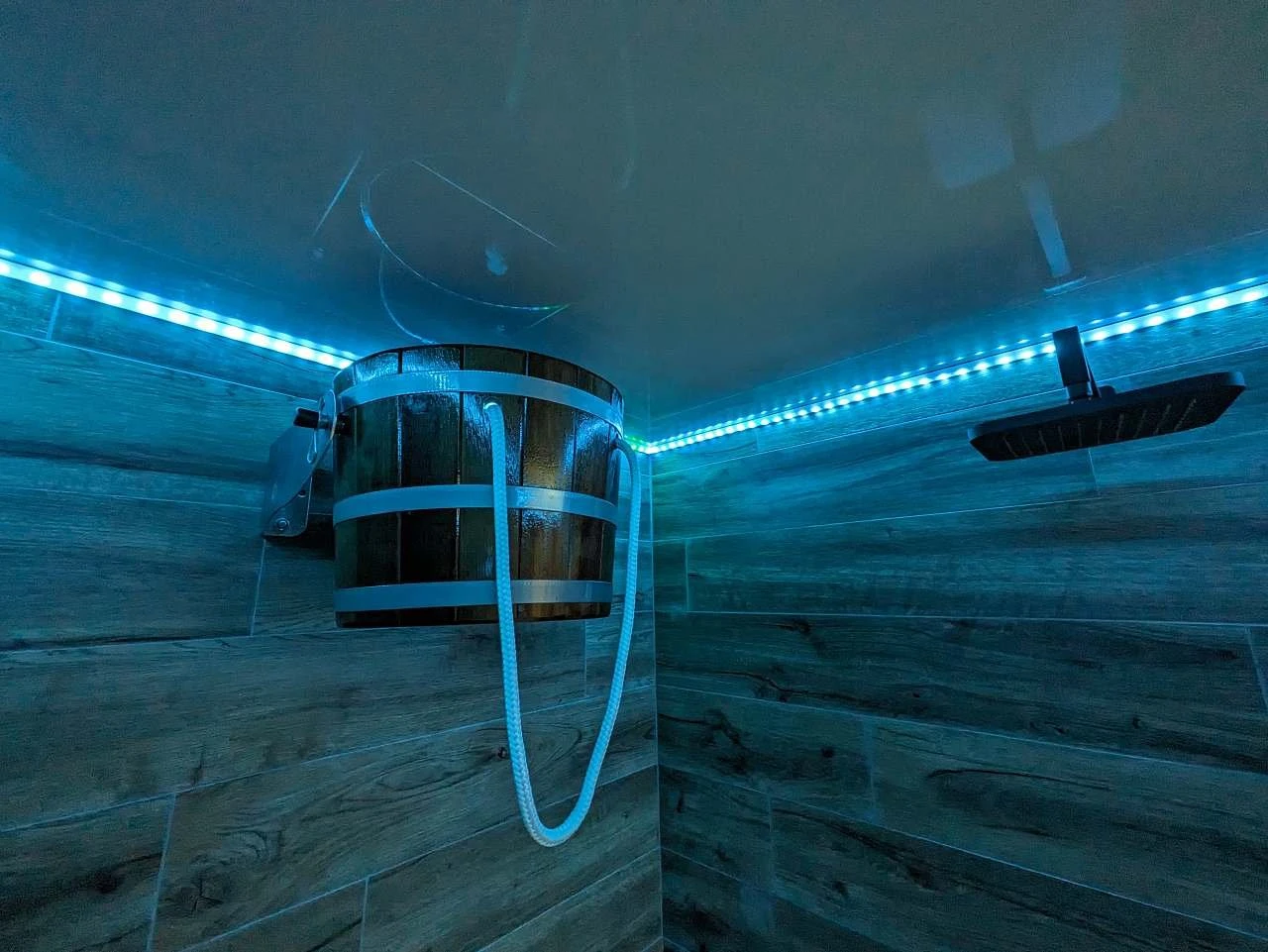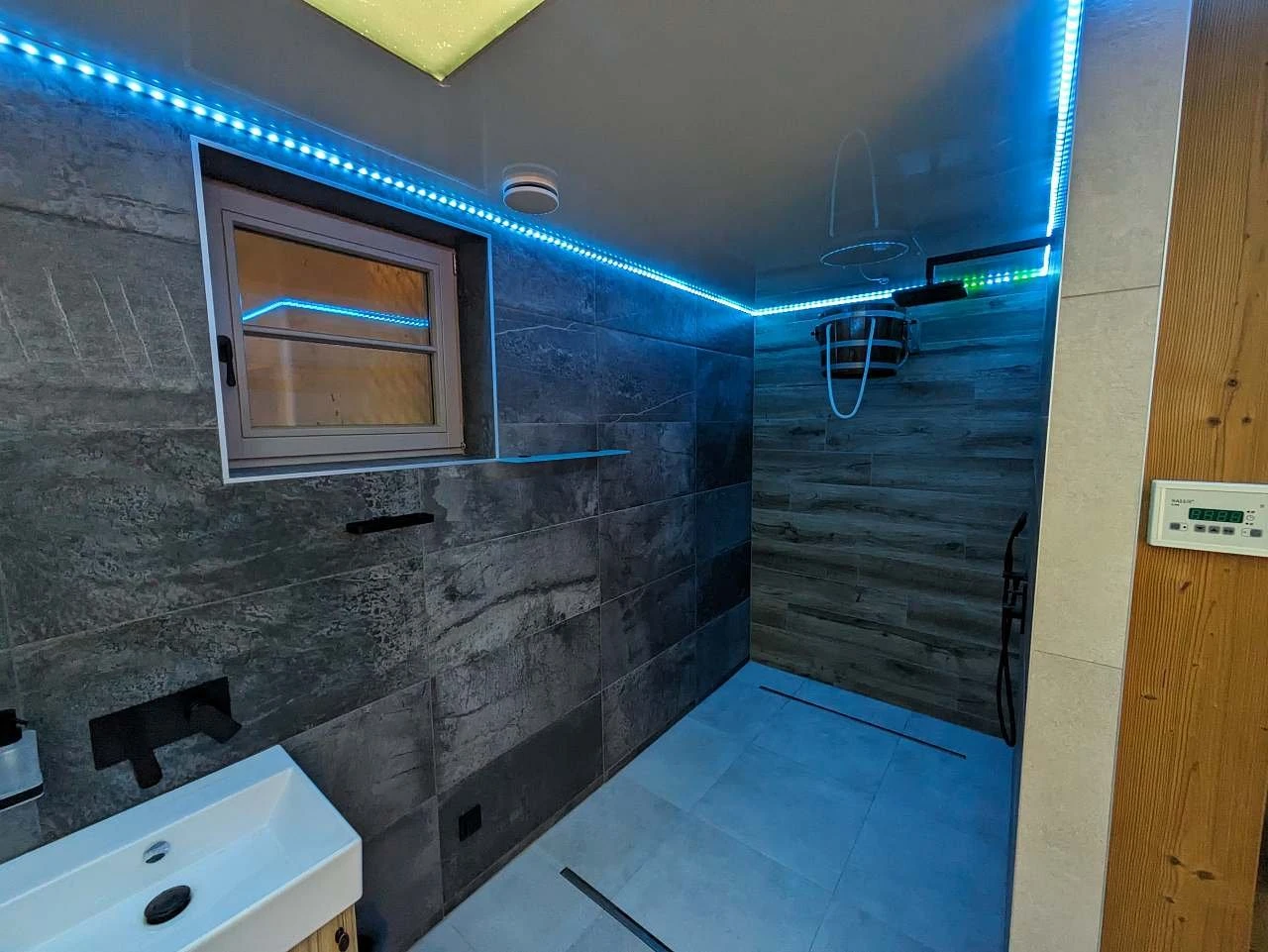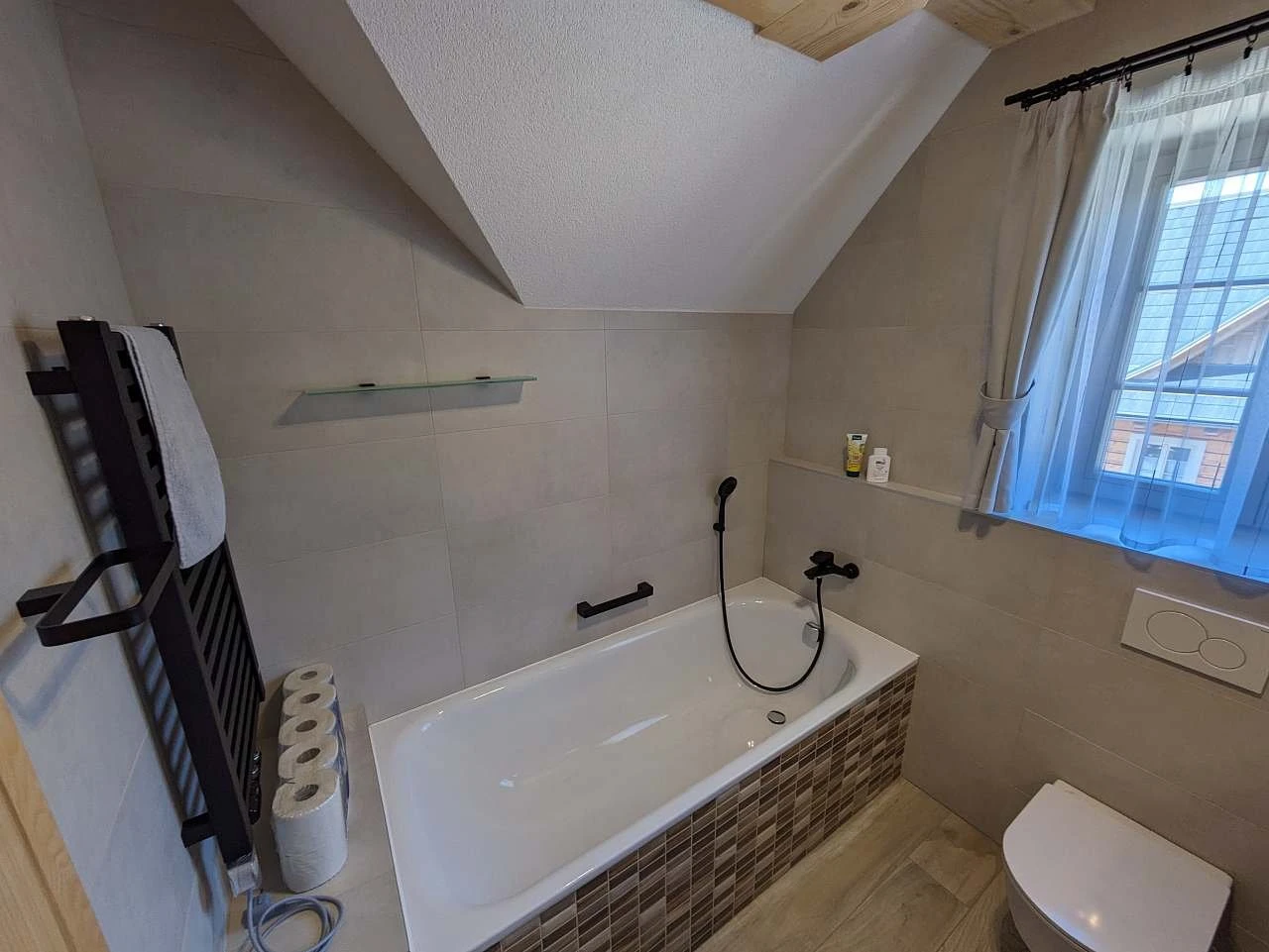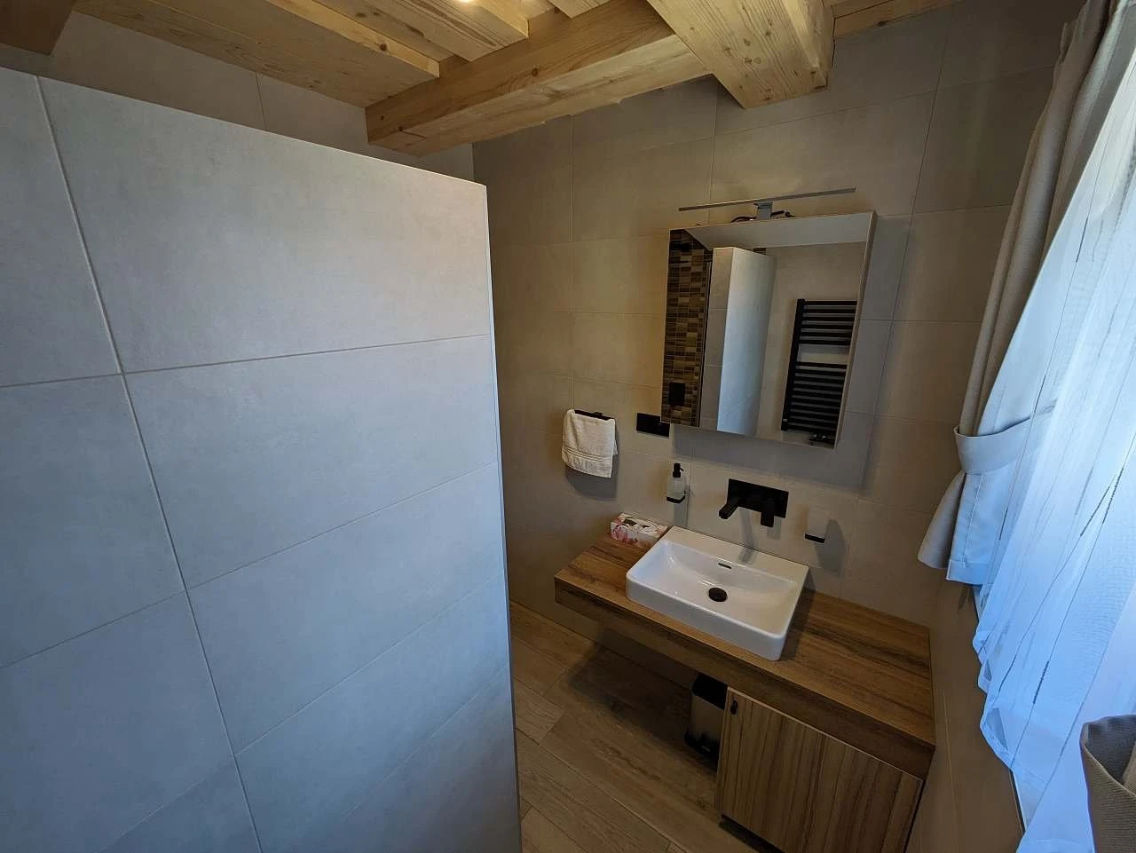 V objektu se nacházejí tři koupelny. Dvě jsou umístěny v patře u ložnic – jedna s vanou, druhá se sprchovým koutem. Třetí koupelna je v přízemí a je součástí wellness zóny, kde navazuje na saunu a vířivku. Všechny koupelny jsou vybaveny toaletou a základním hygienickým zázemím.