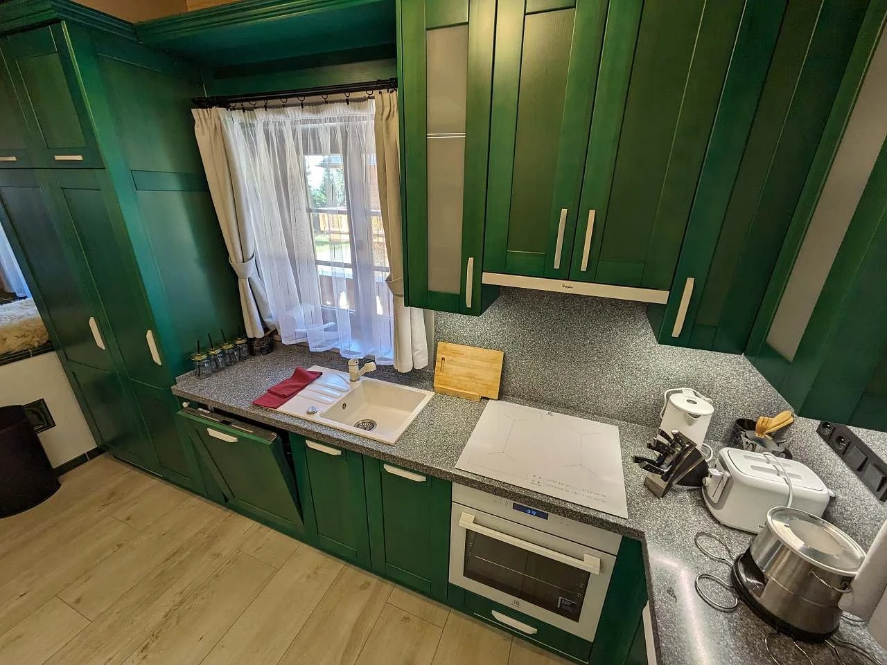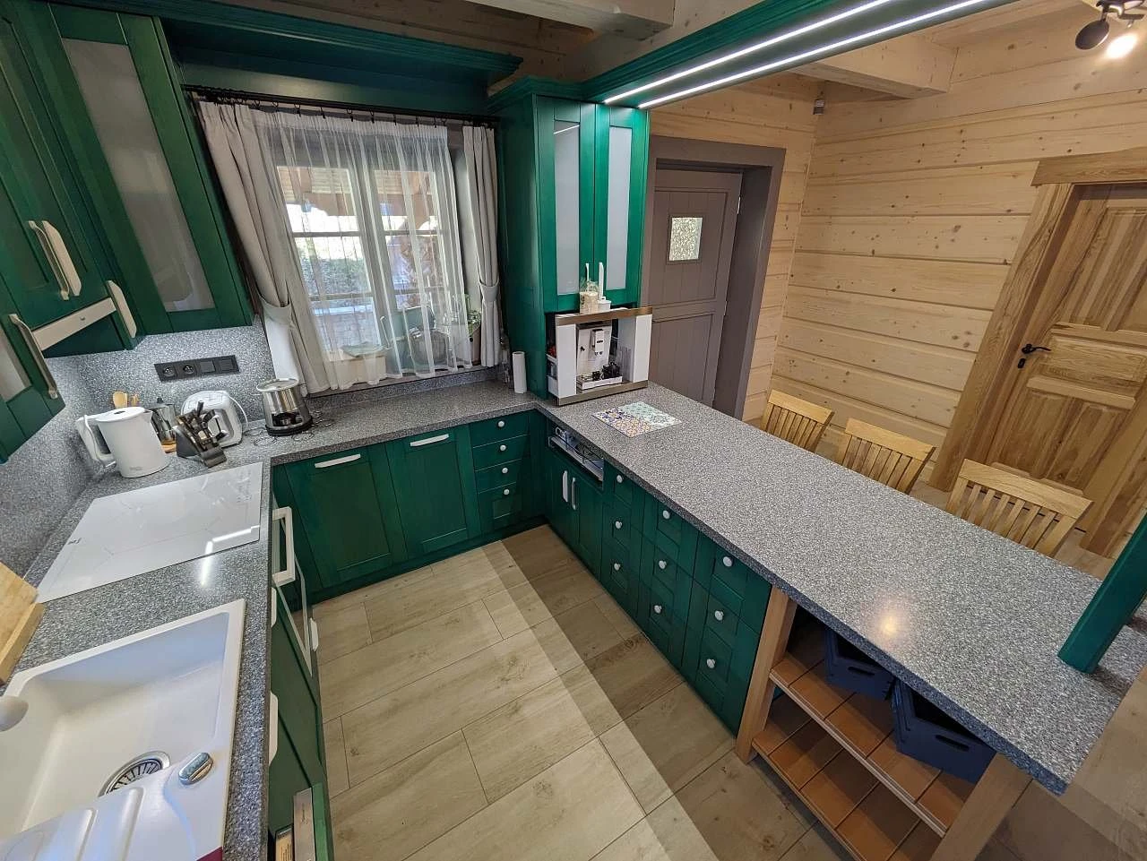 V objektu se nachází plně vybavená kuchyň, která umožňuje přípravu jídel od snídaně až po večeři. K dispozici je kávovar DeLonghi na zrnkovou i mletou kávu, stejně jako konvička na moka kávu. Kuchyň je vybavena také výčepním zařízením a fondovačem pro společné vaření a stolování.