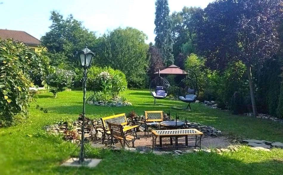Venkovní část nabízí bazén, vířivku, finskou saunu, gril, ohniště a dětský hrad. Pozemek je oplocený a vhodný pro rodiny s dětmi. Povolen je pobyt s domácími mazlíčky a parkování je možné přímo u objektu.